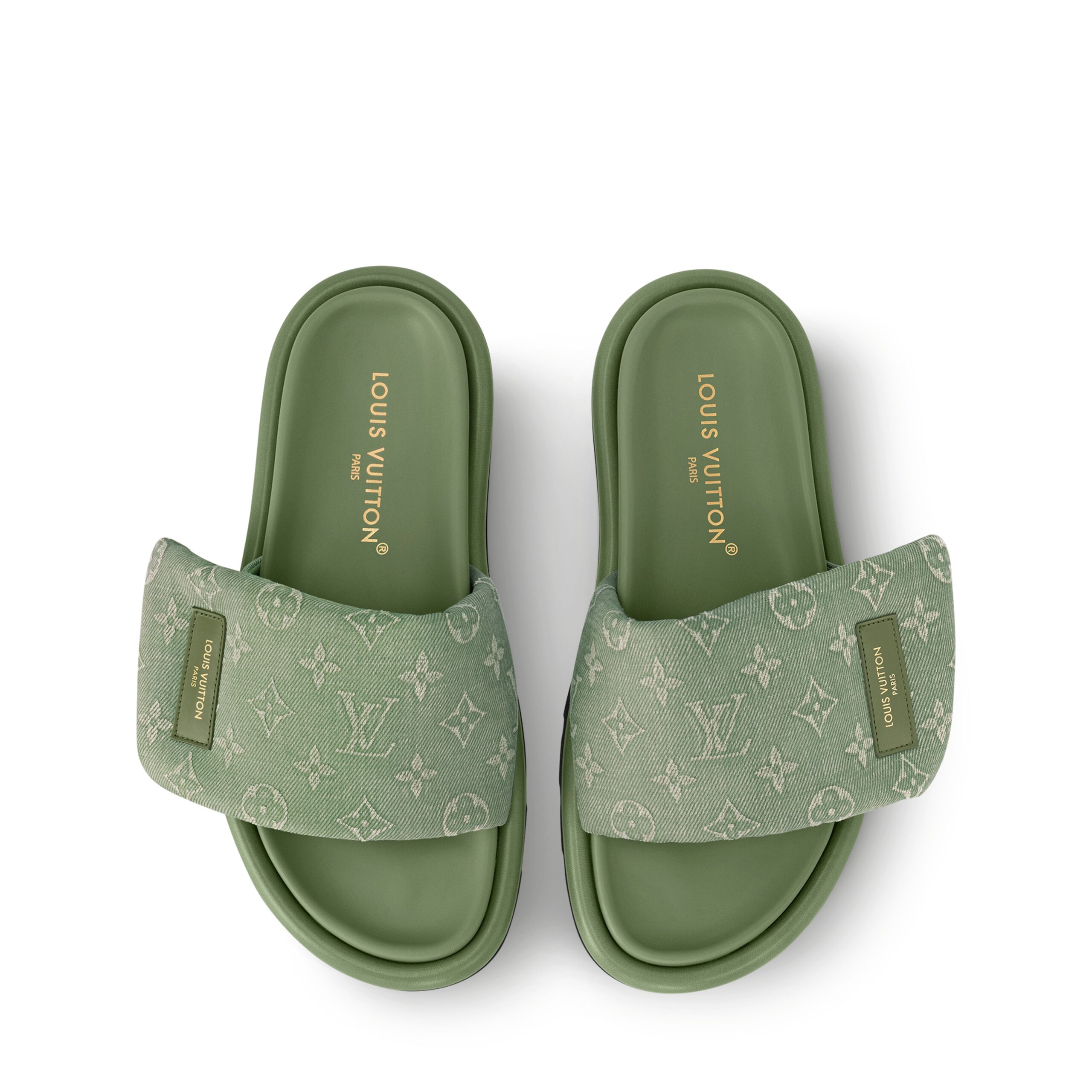 The Pool Pillow flat comfort mule is revisited in Monogram jacquard with a faded, vintage look. At once on-trend and easy to wear, this model is distinguished by its padded, pillow-like front strap, which is adjusted with velcro and signed with a Louis Vuitton-embossed leather label. A comfortable anatomic footbed and lightweight micro outsole complete this design.