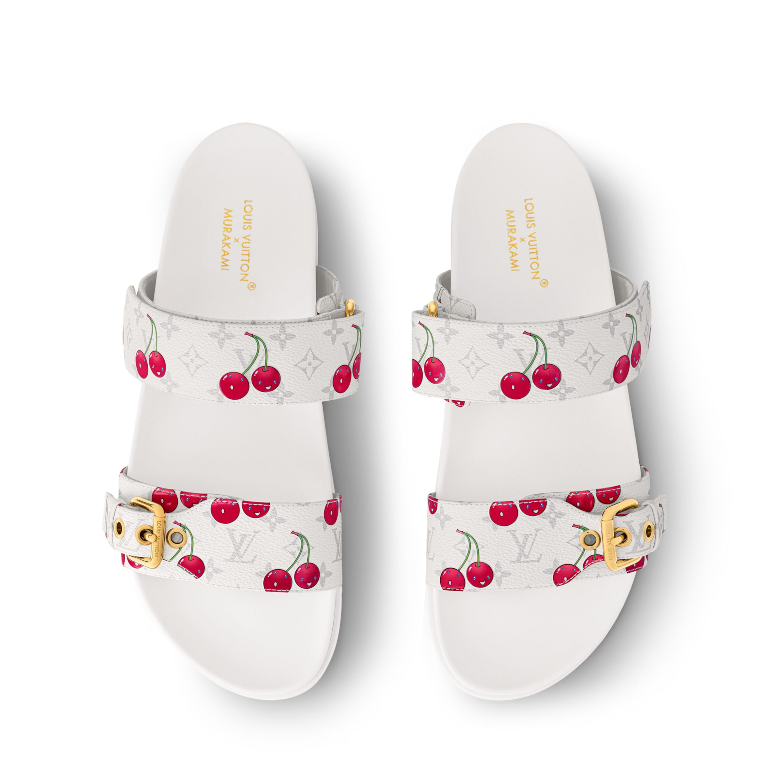 The House’s classic Bom Dia flat comfort mule is playfully uplifted in Monogram cherry canvas in fresh seasonal tones as part of the exclusive re-edition of the Louis Vuitton x Takashi Murakami collection. The top strap is adjusted with velcro, while the lower one is fastened with a chic gold-tone buckle. This casual style is complete with an anatomic insole and slip-resistant outsole.