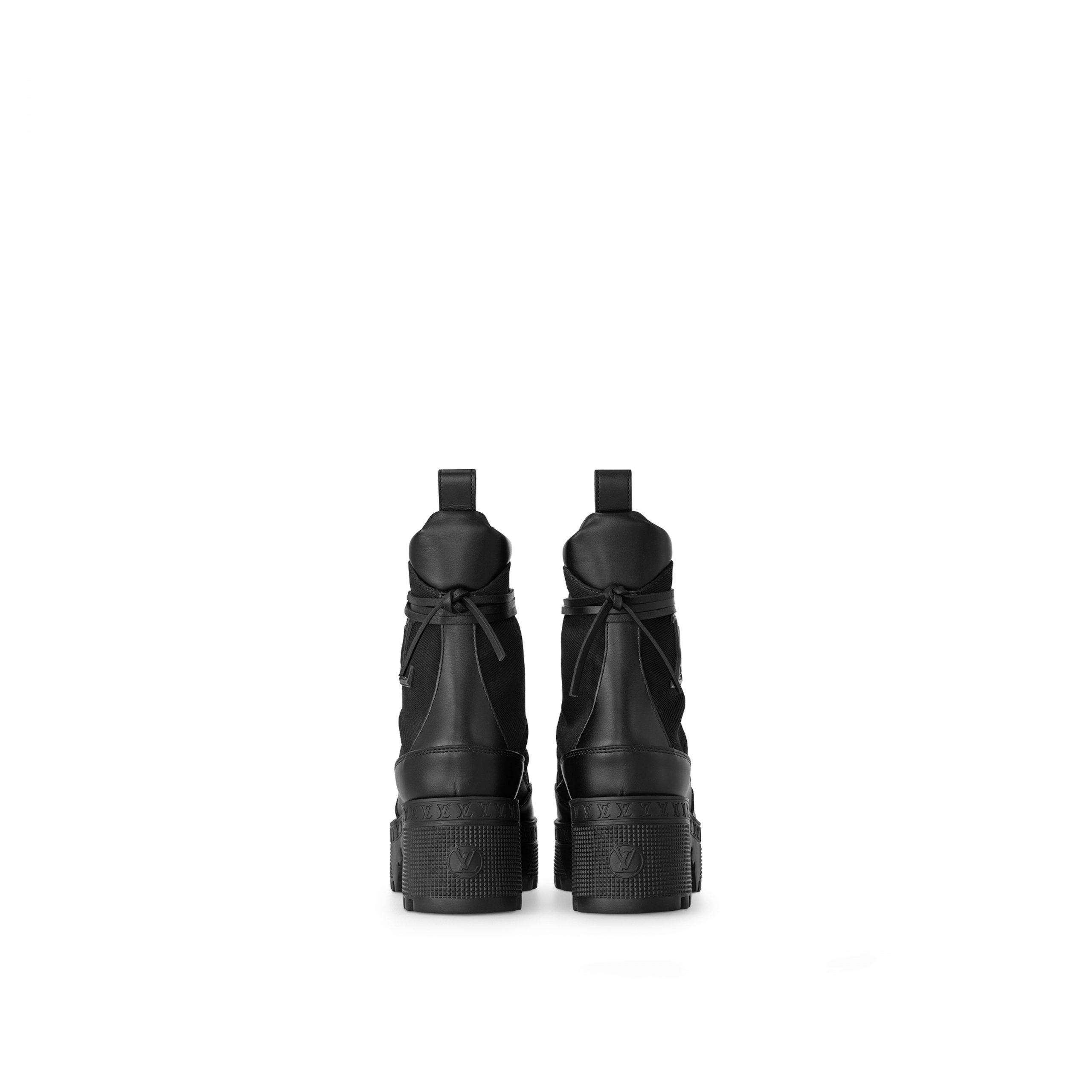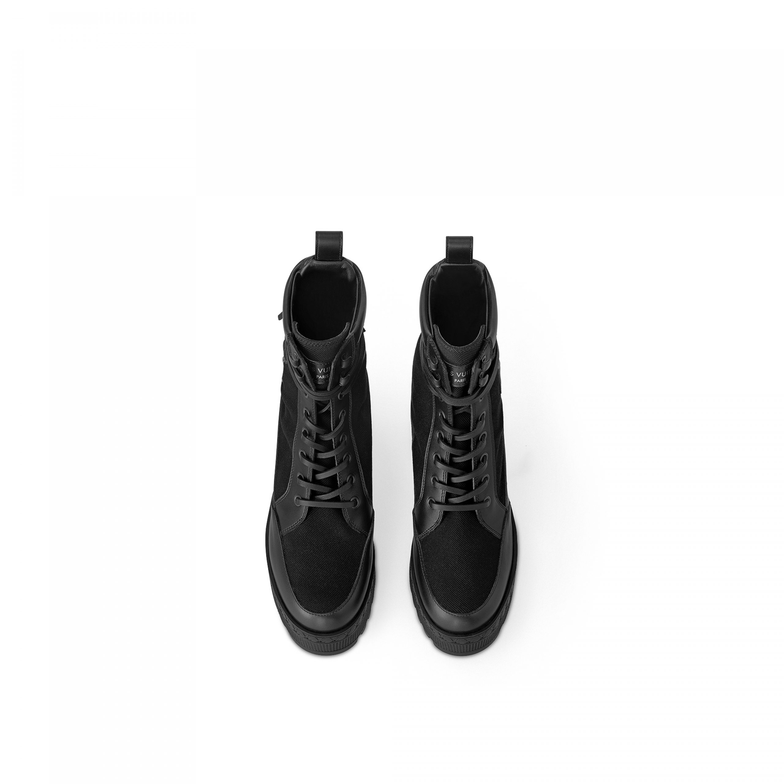 An icon of the Louis Vuitton shoe collection, the Laureate platform desert boot is reworked in a canvas version with calf-leather trim and laces. Its lightweight platform outsole is decorated with a row of LV Initials, referencing the lozine edging of the historic trunks. This model is signed with an oversized LV Initials logo on the side.