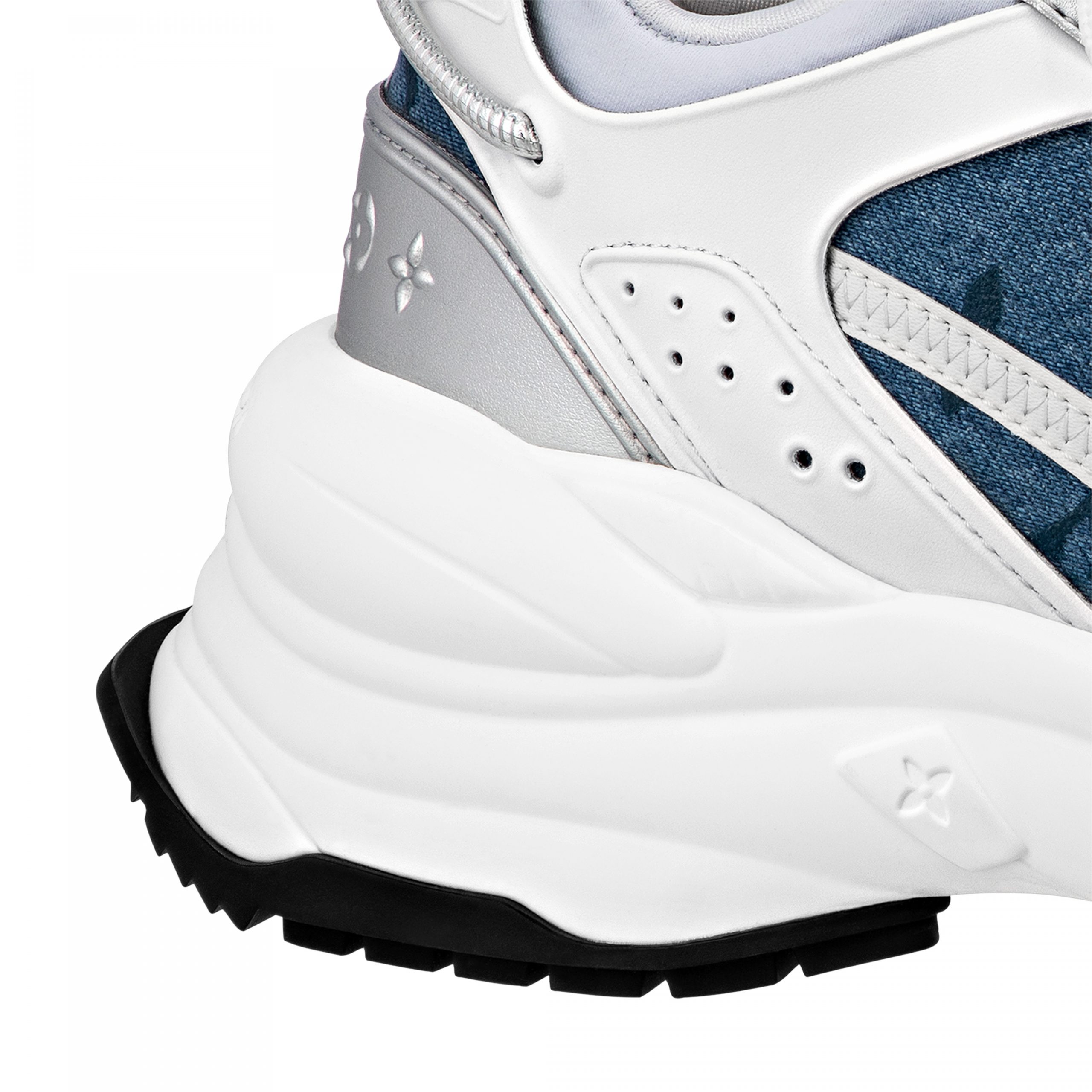 This summery version of the Run 55 sneaker combines Monogram denim with lycra, calf leather and metallic lambskin. This sporty model is distinguished by its lifted rubber outsole, which is designed for optimum bounce and comfort. Among its many signature details is a row of Monogram Flowers on the silver-tone spoiler at the back.