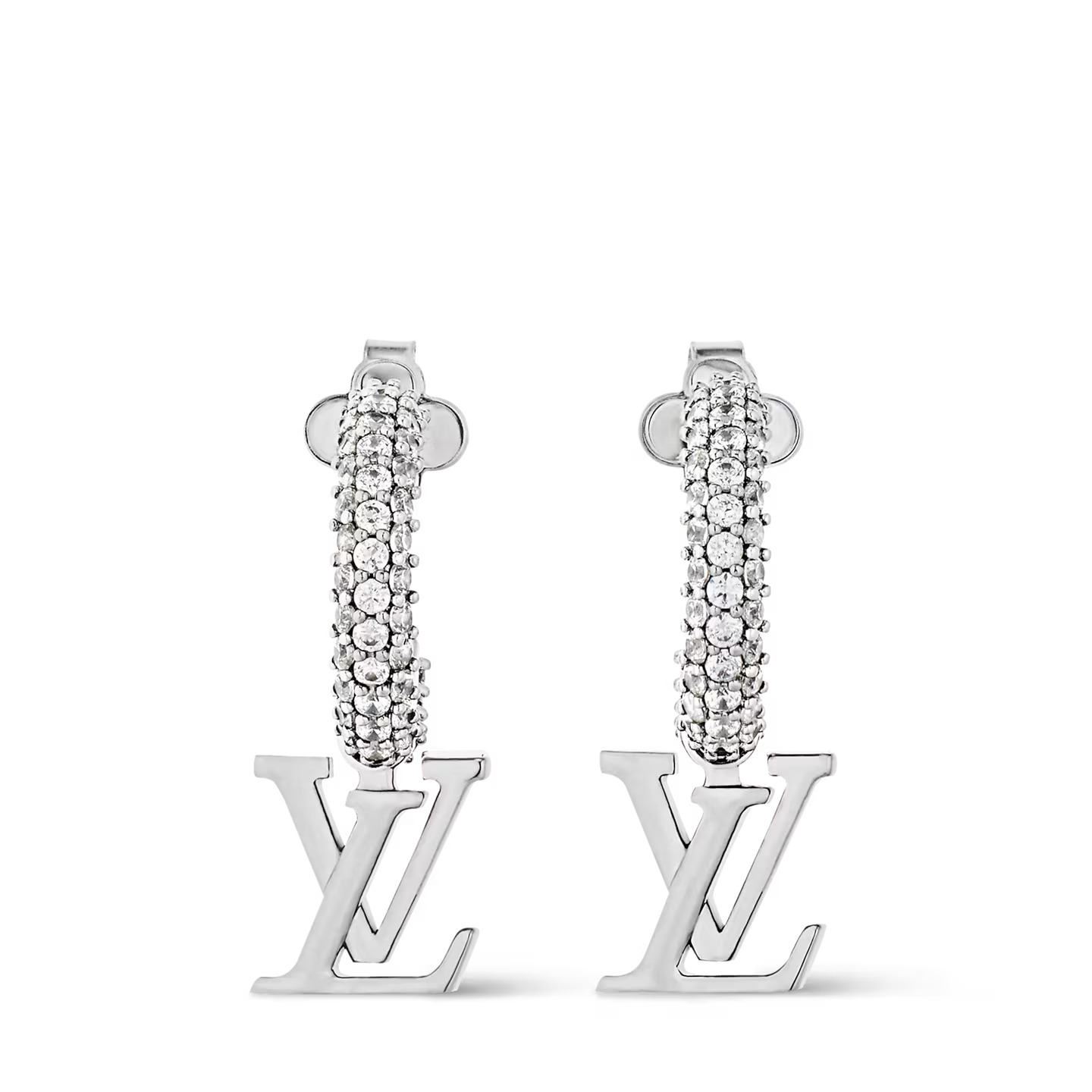 The finely crafted LV Iconic earrings offer a sophisticated new way to wear one of the Houseís most recognizable signatures. The famous LV Initials are attached to hoops of lustrous palladium-tone metal delicately encrusted with sparkling crystals. Light and comfortable, these resplendent earrings add a glint of radiant elegance to any look.