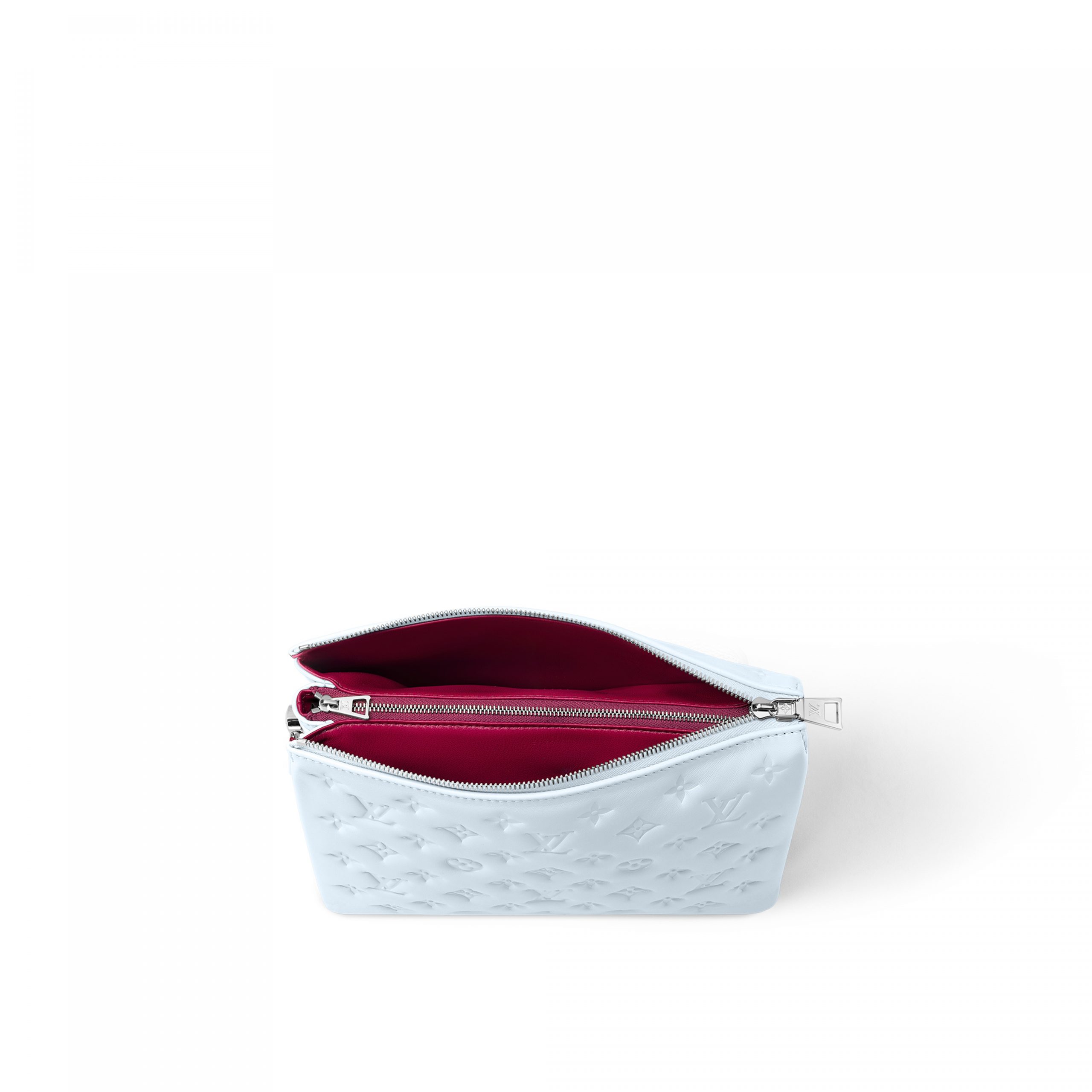 Crafted from puffy, Monogram-embossed lambskin, the Coussin PM hand bag comes in a refreshing new colorway. Comfortable to carry as a clutch, it can be worn on the shoulder with its chunky chain or cross-body thanks to its wide Louis Vuitton textile strap. Its design is composed of two compartments separated by a zipped pocket.
