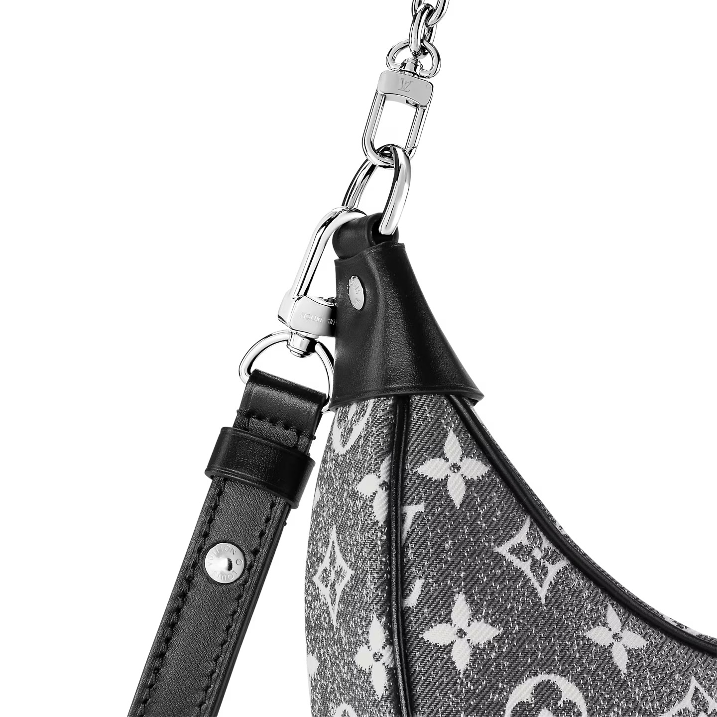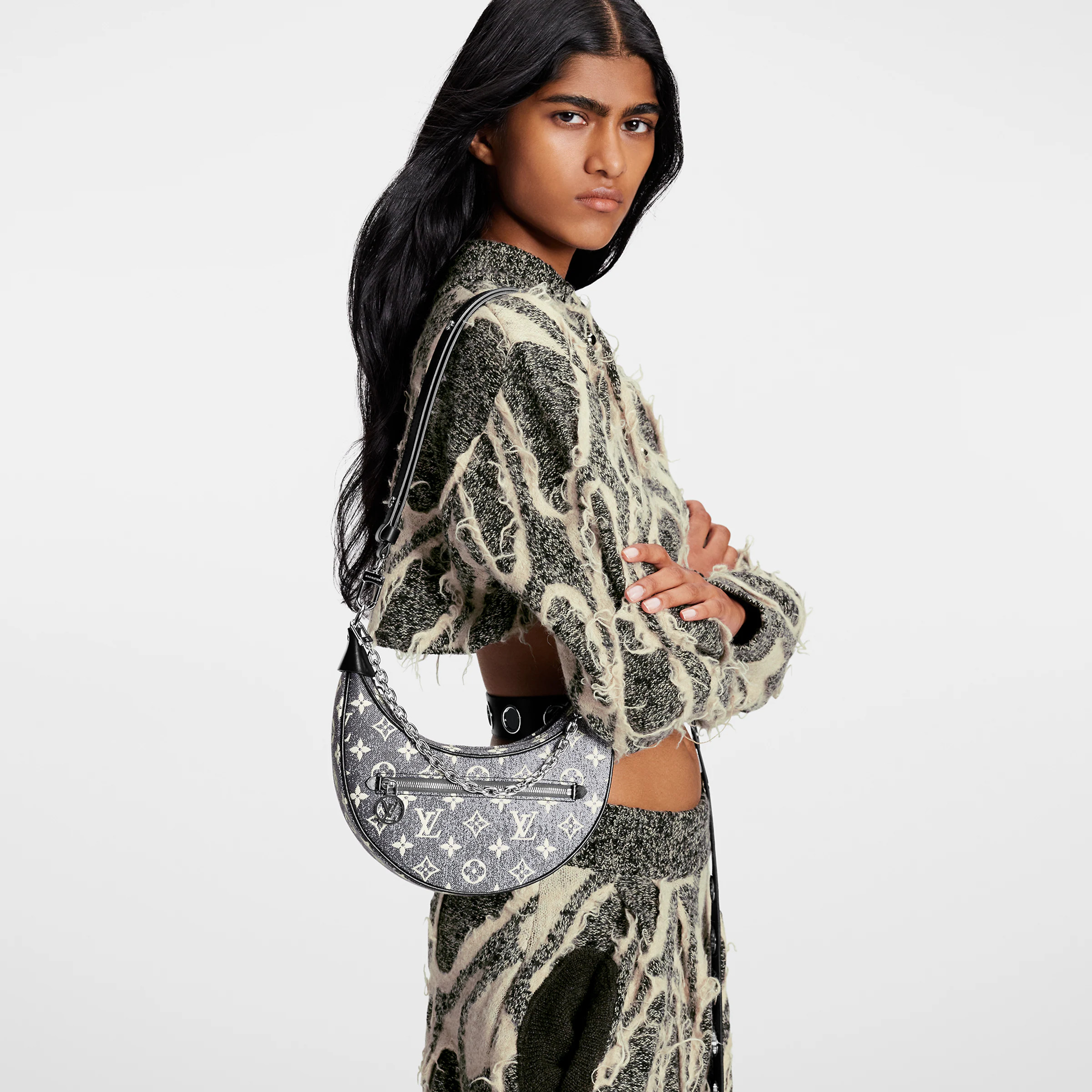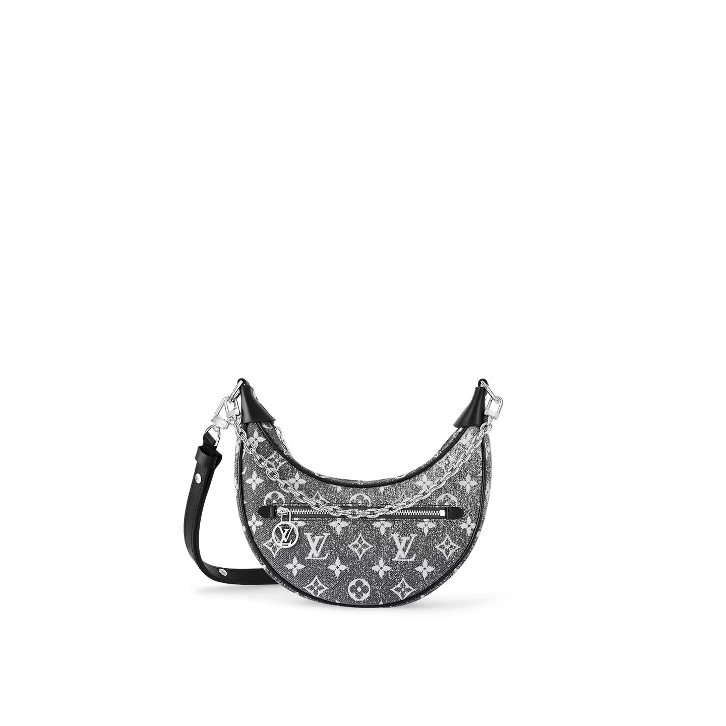 This edition of the Loop PM bag wears new Monogram Jacquard Denim, introduced at the Cruise 2023 show. The gray colorway and stone-washed effect give the bag a modern rawness, in contrast to the gleaming silver-tone hardware. The reverse jacquard lining lends a surprising touch; the Louis Vuitton Circle zip pull adds a signature flourish.