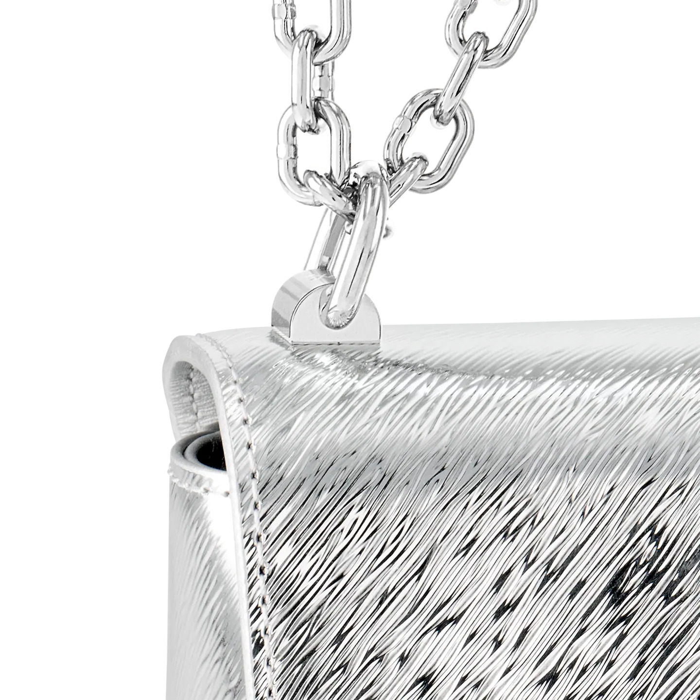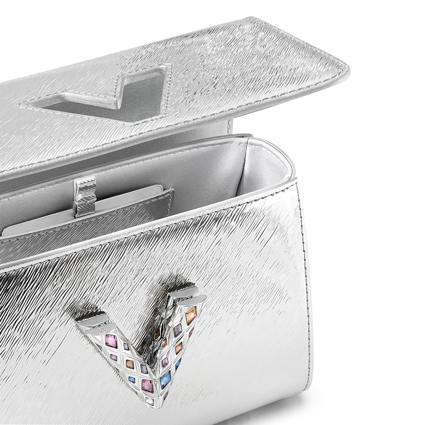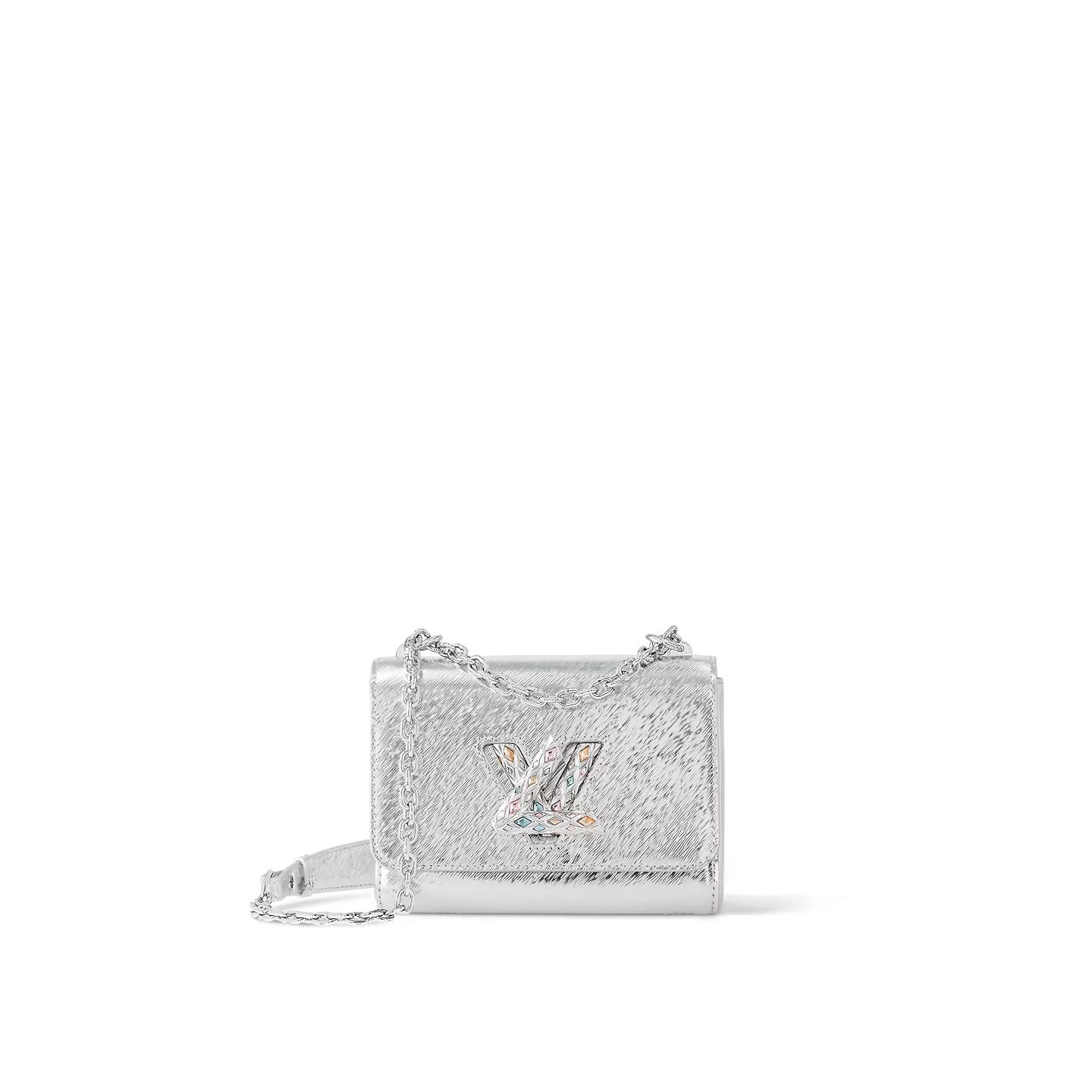 Made from mini Epi leather with a mirror effect, the Twist PM handbag has a silver LV Twist lock covered with Swarovski strass with a quilted aspect, reminiscent of the quilting found inside Louis Vuitton trunks. The chain, braided with leather, enables shoulder and cross-body wear. The bag is roomier than expected, thanks to its “wave” base.