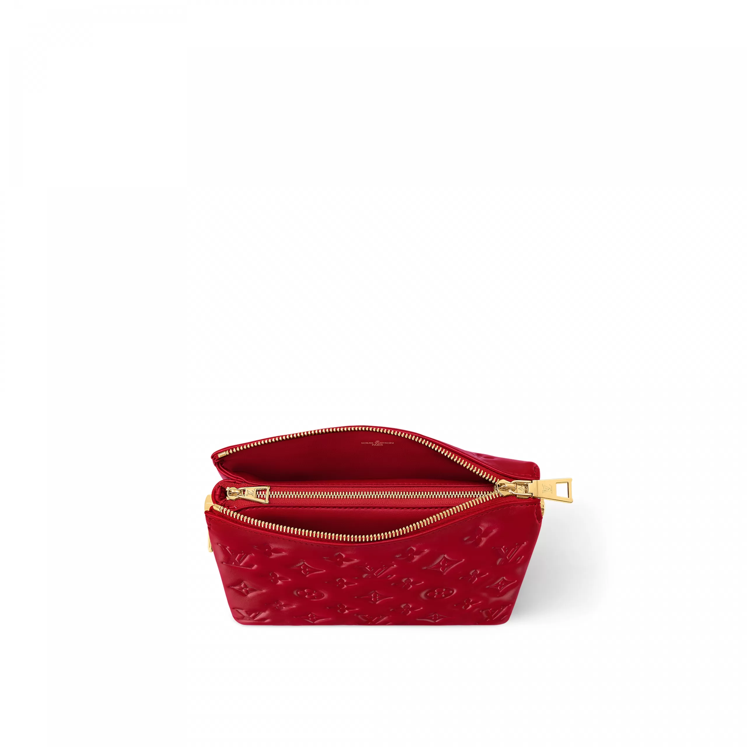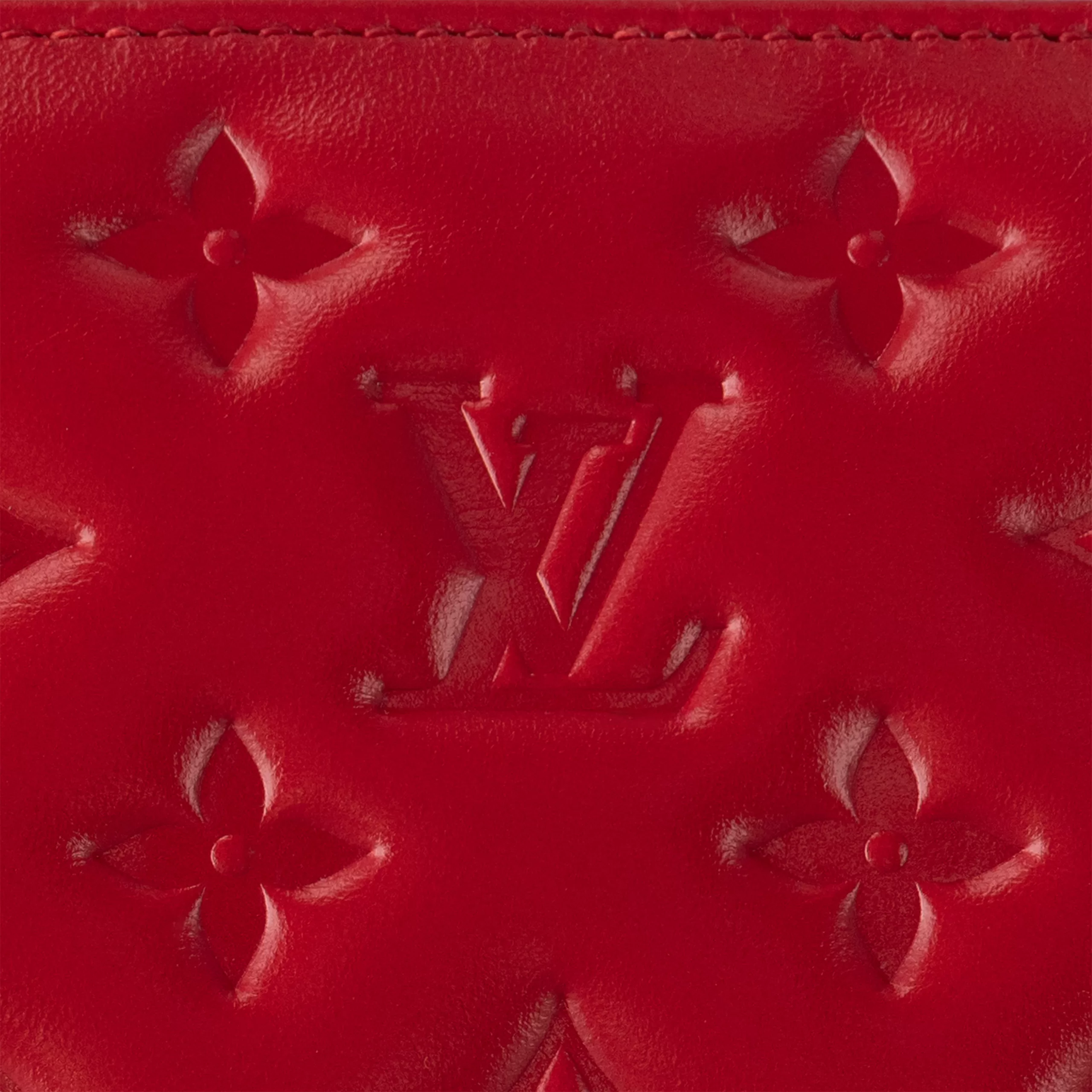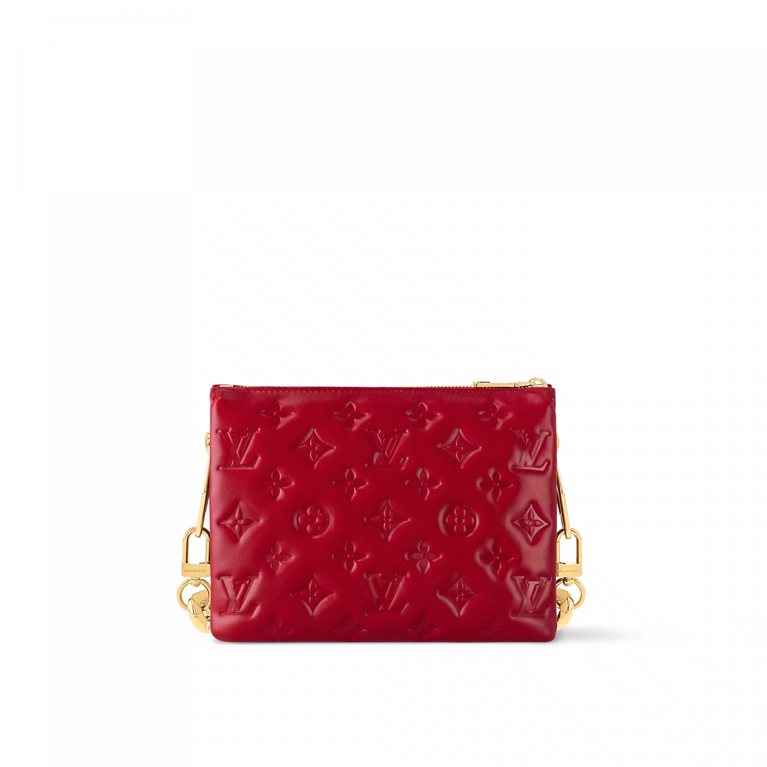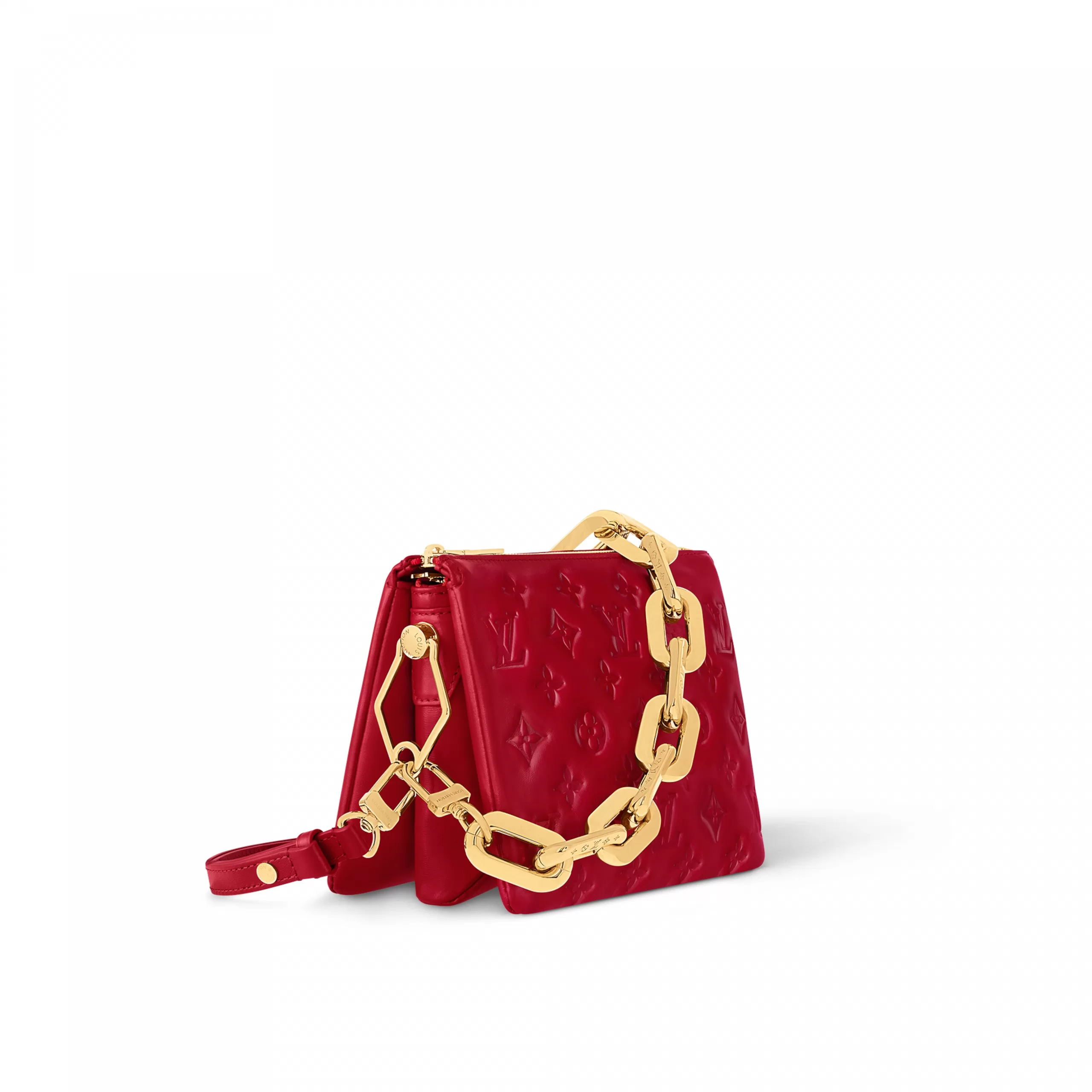 This Coussin BB handbag in padded lambskin with its chunky golden chain is part of the Nautical Collection. The embossed Monogram pattern is echoed by the tiny LVs and Monogram Flowers engraved on the chain’s links. The interior has two compartments separated by zipped pocket.