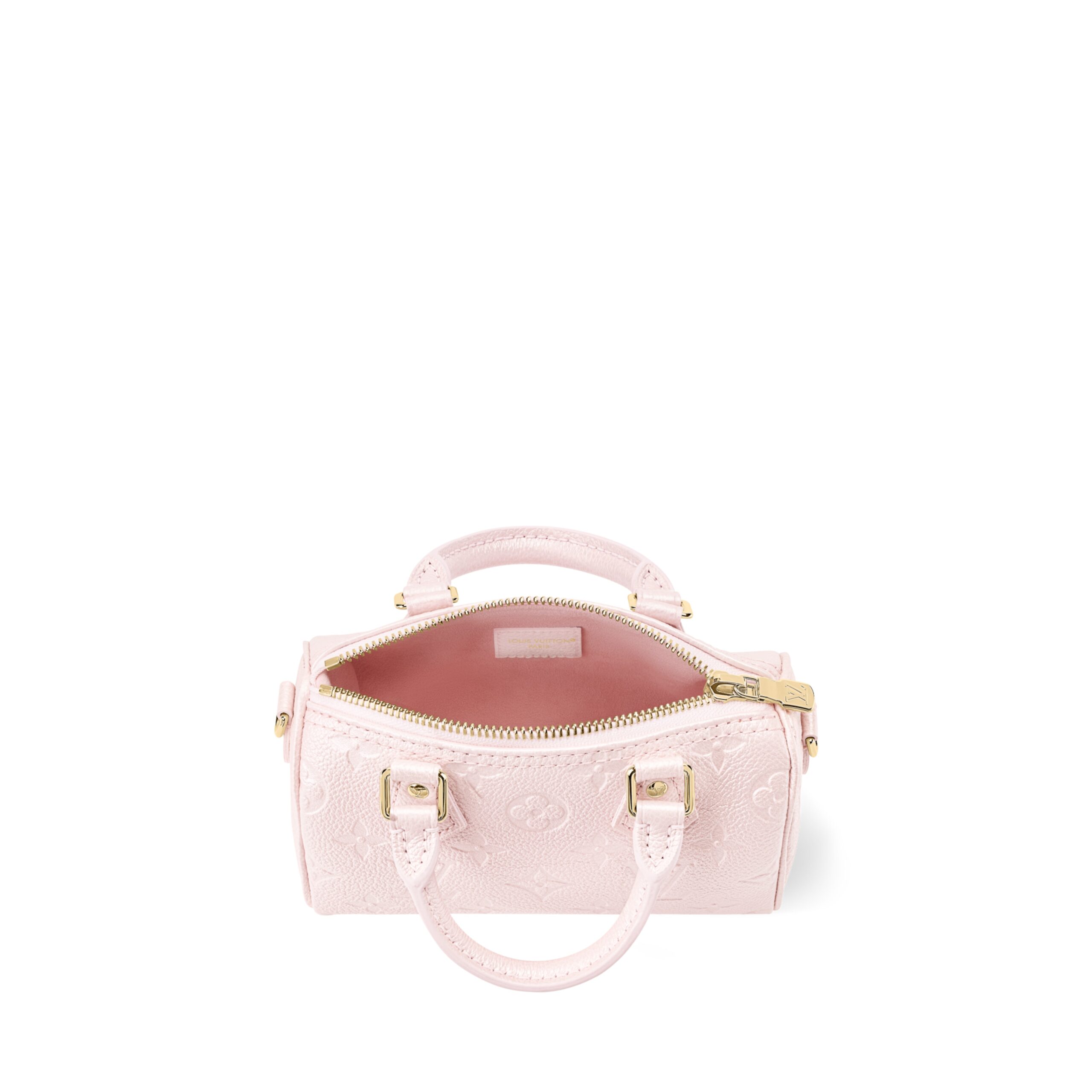 The Nano Speedy is updated as part of the Monogram Empreinte Shimmery collection in a chic Snowy Pearl colorway. It is made from cowhide leather accented with silver-toned hardware and includes a removable charm, showcasing Louis Vuitton signatures such as a padlock and Monogram Flower. The elegant style can be worn multiple ways and is sized to fit daily essentials.