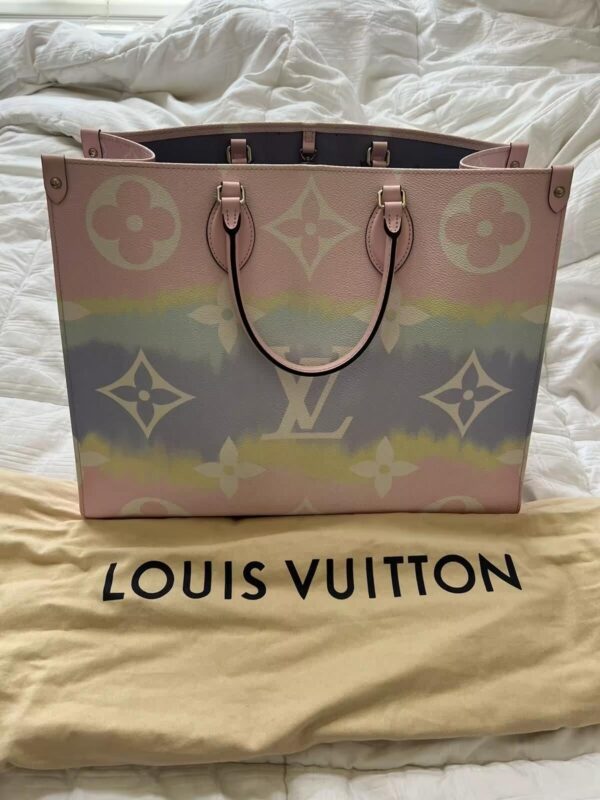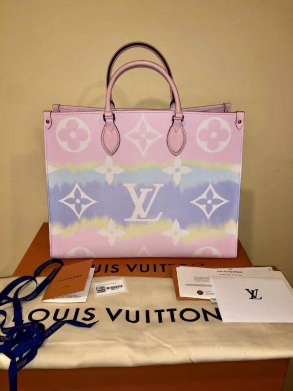 Fashioned from Monogram Giant canvas, the Onthego tote bag is as striking as it is practical. Onthego large Tote bag follows the traditional Japanese dyeing process, knotting, folding and dyeing the fabric, showing the fresh beach interest of the Louis Vuitton Escale series in the summer of 2020. With its generous capacity, shoulder straps and iconic Toron top handles, this versatile GM model is an ideal bag for everyday wear.