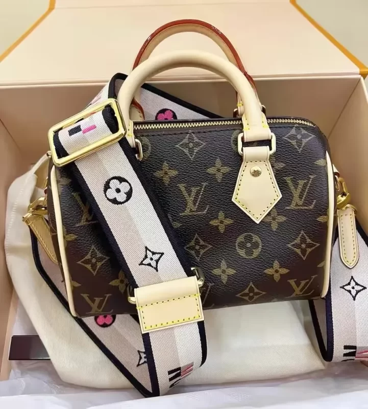 Like a diminutive version of the House’s historic Speedy travel bag, the Speedy Bandoulière 20 handbag is crafted from Monogram canvas with natural cowhide trim. In addition to the rolled leather top handles, there’s a wide detachable and adjustable textile strap with a woven Louis Vuitton signature. This bag’s classic design is completed with red textile lining.