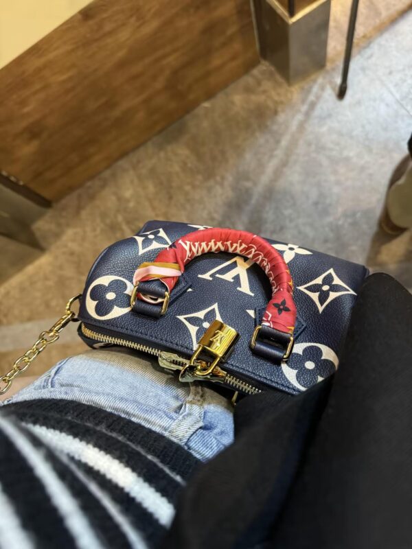 Two-color Monogram Empreinte cowhide leather brings a luxurious aspect to the Speedy Bandoulière 20. The Monogram is first embossed into the navy-blue leather, then the pattern is printed in cream on top of the embossing. Part of the Nautical Collection, the Speedy features two top handles and a removable and adjustable strap for shoulder carry.
