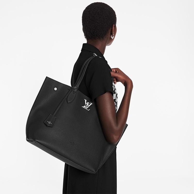 Dedicated to the elegant, active woman, this Lockme Go tote offers both flawless functionality and uncompromising style. Crafted from soft, grained calfskin, with double handles designed for comfortable over-the-shoulder wear, this essential modern carry-all is accented with a silvery Louis Vuitton turn lock and two snap buttons to keep belongings secure.