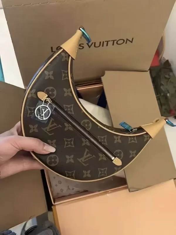 Created by Nicolas Ghesquière for the Cruise 2022 Collection, the Loop handbag is a half-moon baguette, inspired by the Croissant bag from the House archives. It has a body-friendly, compact shape and a chain for shoulder carry, as well as a cross-body leather strap. The front zip pocket closes with a Louis Vuitton Circle zip pull.