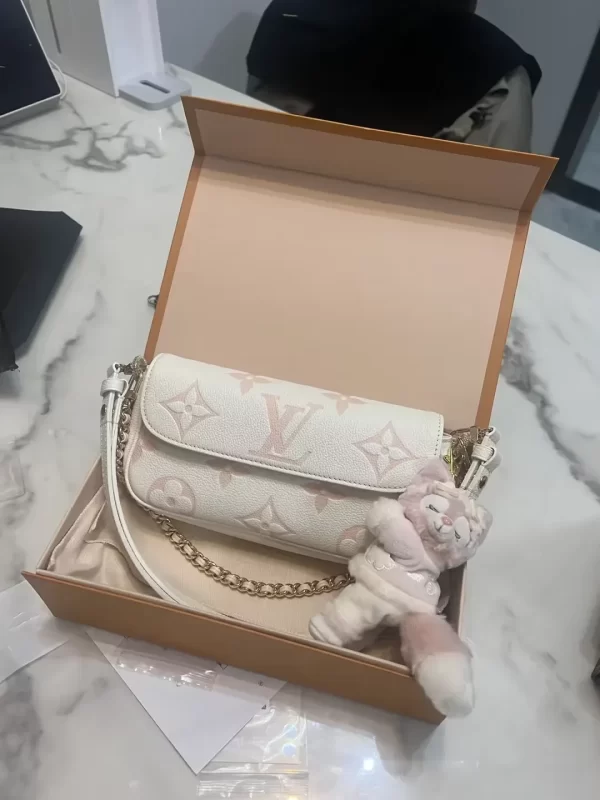 This seasonal edition of the Ivy wallet on chain is crafted from Monogram Empreinte leather in two pastel shades. An ideal day-to-evening bag, this model has a soft, body-friendly shape and a flap with a magnetic closure. Its removable, adjustable leather strap and removable chain, interlaced with leather, offer different carry options.