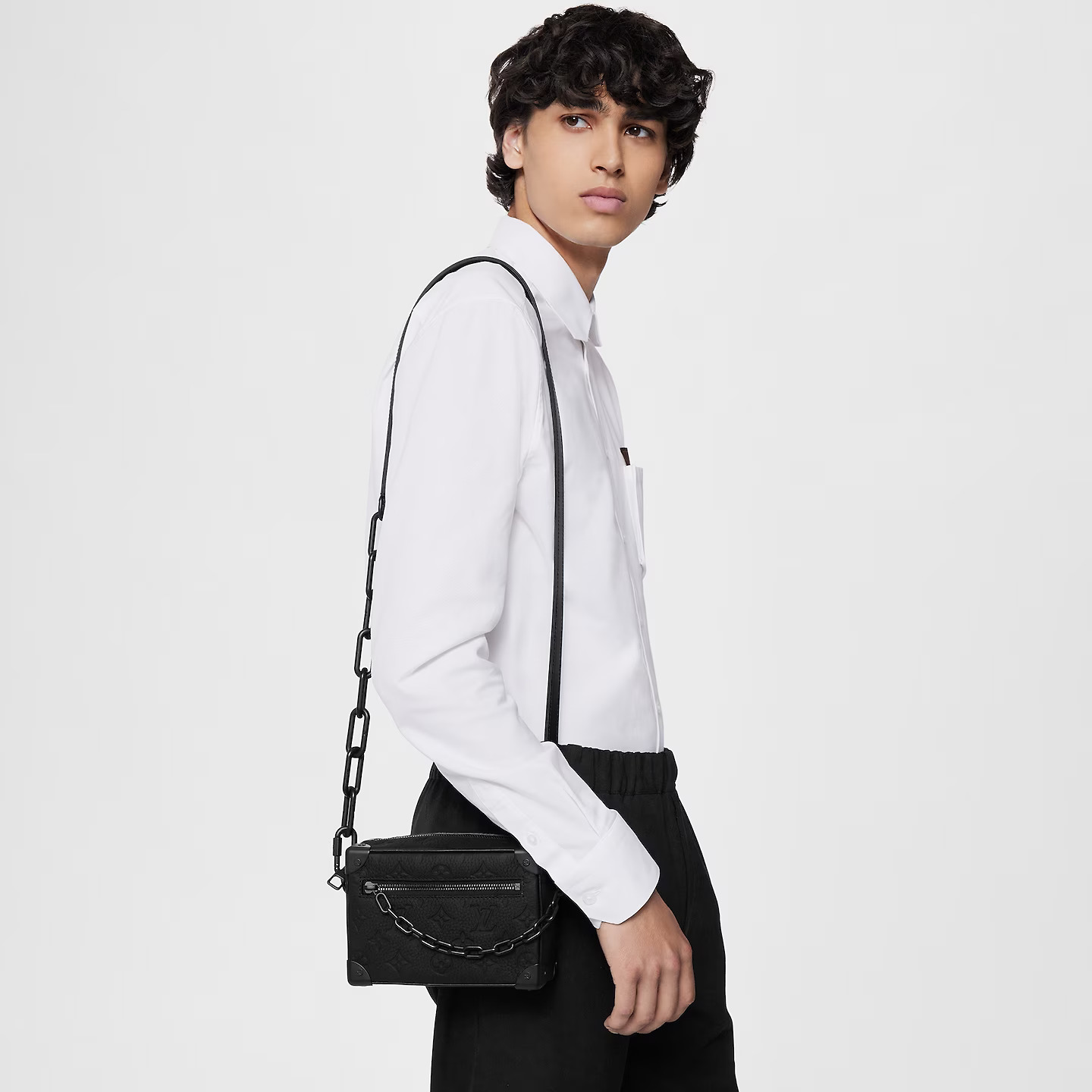 With its riveted corners and boxy shape, the Mini Soft Trunk bag in black Monogram-embossed Taurillon leather is a direct descendent of Louis Vuitton’s original trunks. The two matte-black chains, one connected to the zipper and the other serving as part of the shoulder strap, bring modernity to this small bag.