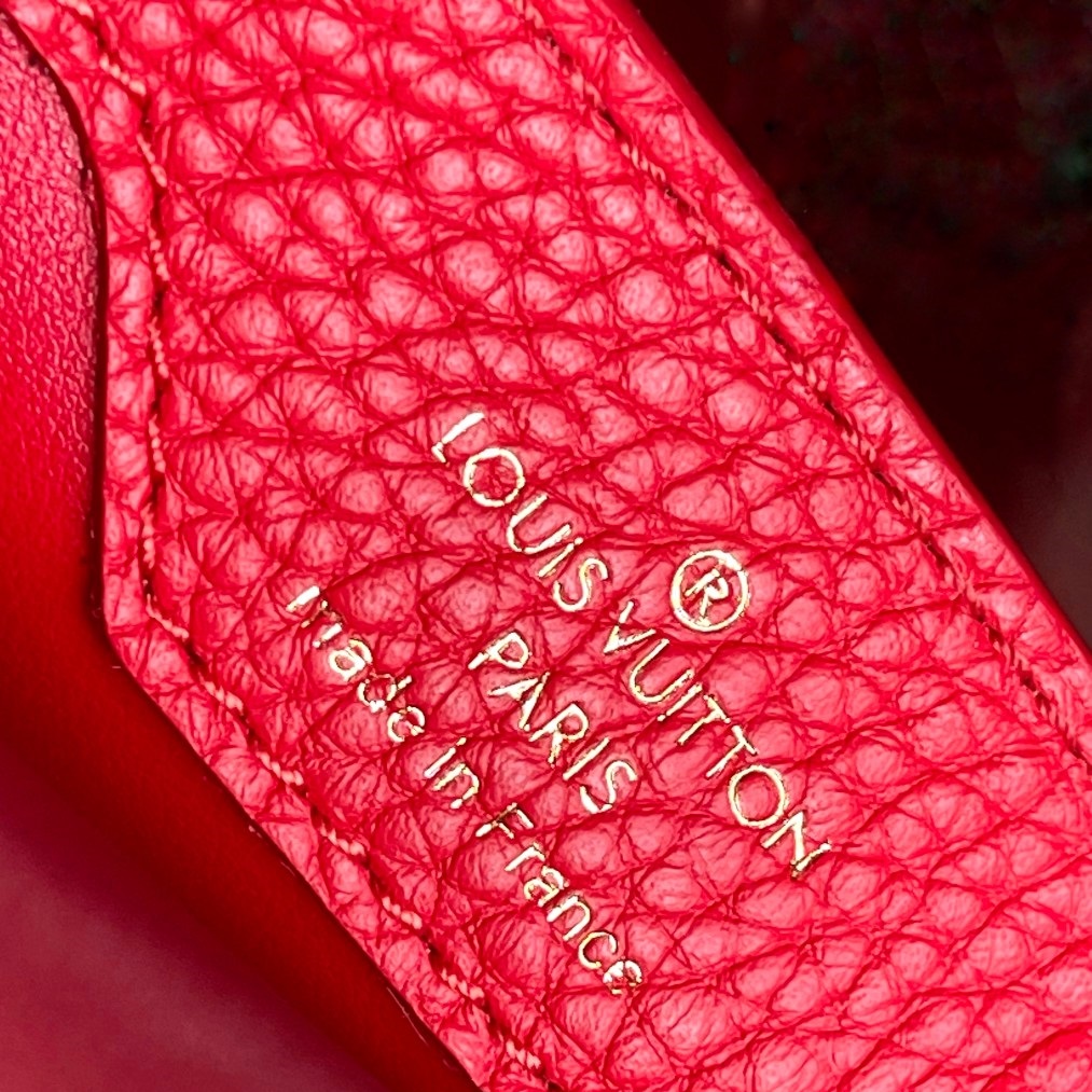 Lined with orange leather, this Capucines BB handbag is fashioned from full-grain Taurillon leather in a soft gray tone, with exotic python leather on the top handle, flap, and LV Initials. The wide removable strap, also in Taurillon leather, enables comfortable shoulder and cross-body carry.