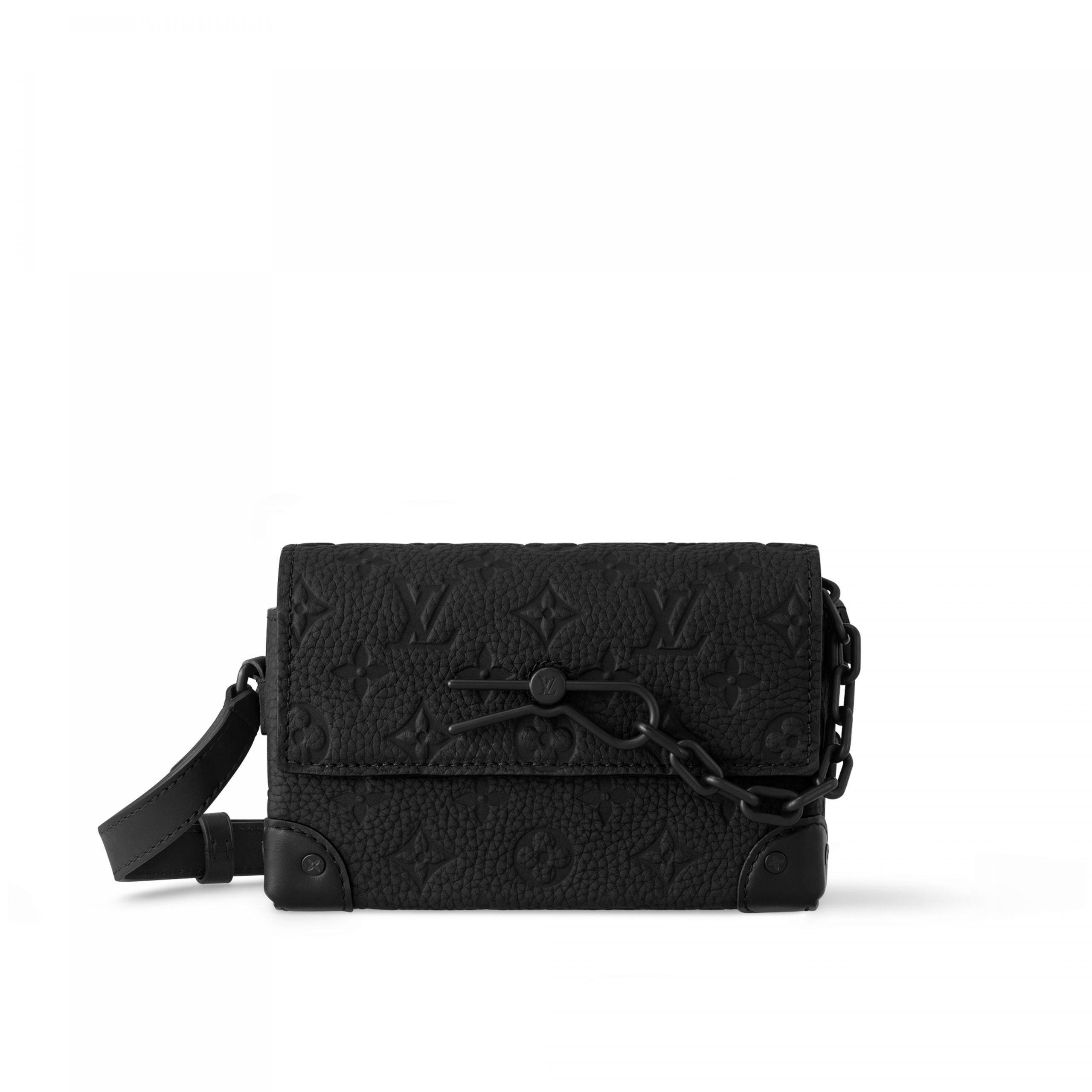 The Steamer Wearable Wallet is made from Taurillon leather embossed with the Monogram pattern and finished with black hardware, including the signature chain-and-pin detail. The inside zipped pocket keeps belongings secure. It can be worn comfortably on the shoulder thanks to its adjustable strap.