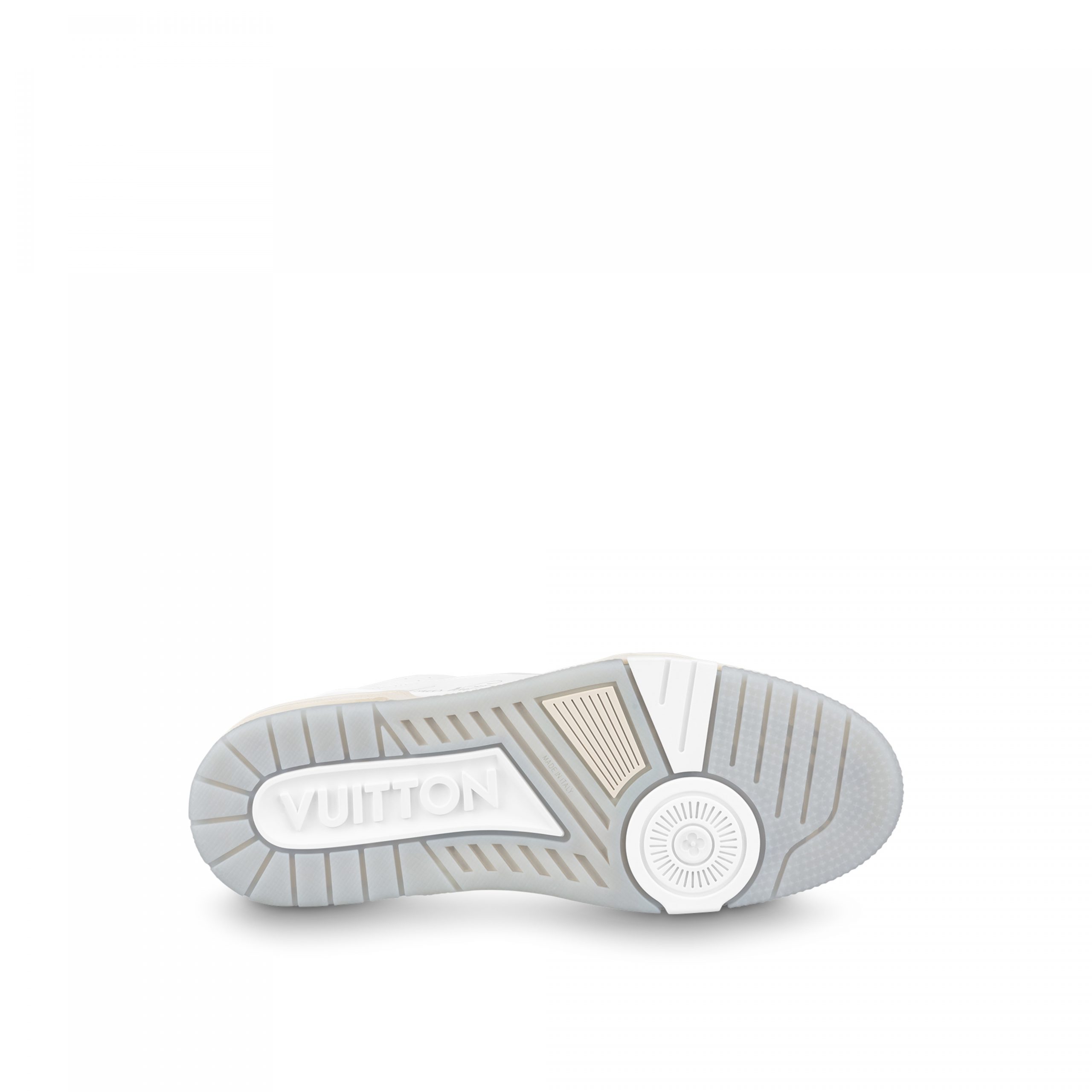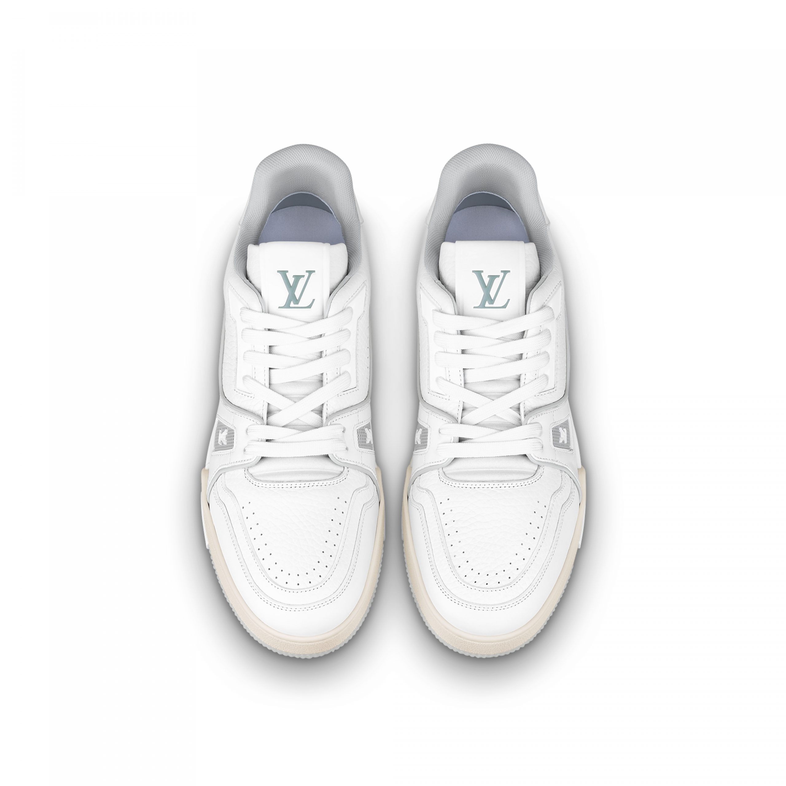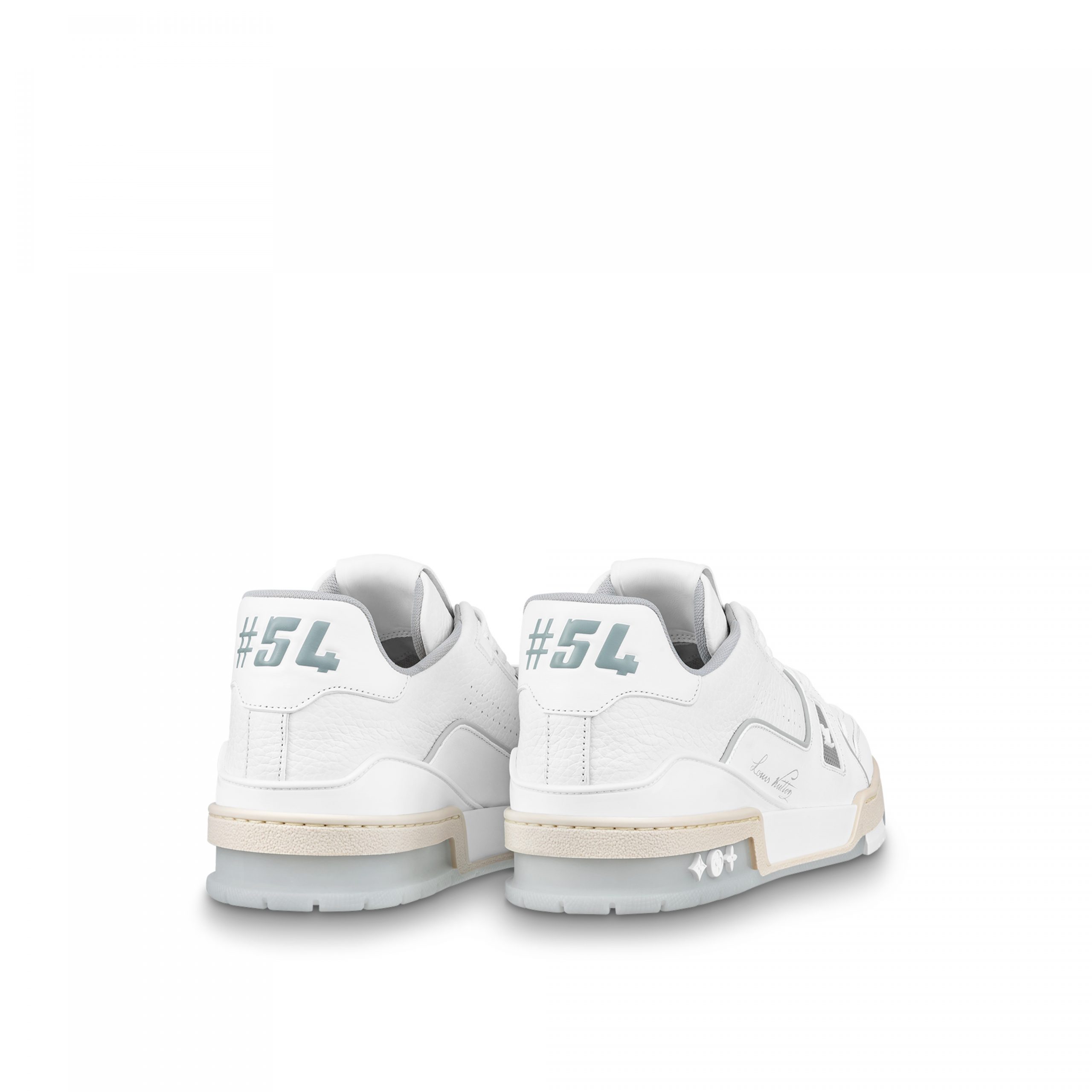 This monochrome version of the LV Trainer sneaker combines smooth and grained calf leather. Inspired by vintage basketball sneakers, this cult model was designed by Artistic Director Virgil Abloh, whose handwritten Louis Vuitton signature is embossed on the side. The #54 signature at the back refers to 1854, the year the House was founded.